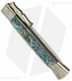 This Italian Stiletto from A.G.A. Campolin comes in the Bat Swinguard style with an abalone handle, dagger blade, and a diamond shaped firing button. A.G.A. Campolin offers some of the finest traditional Italian Stiletto’s on the market, with a variety of collectible styles to choose from. This Bat Swinguard model has an abalone handle with nickel silver bolsters and buttons. Brass pins and liners add a classic touch to the design. The blade comes in a dagger style with a plain edge and a polished finish. Add a piece of Italian history to your collection with the A.G.A. Campolin 13″ Bat Swinguard Stiletto.