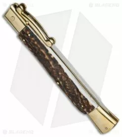 An impressive interpretation of the classic swinguard from AGA Campoloin. This knife measures 13 inches when opened and has a stylized swinguard. It features a polished stainless steel dagger blade, brass firing button, and a brass sliding safety. The rich stag handles are offset with brass pins, liners, and bolsters. The blade has fast, smooth action in spite of its size. The unique swinguard design gives the knife an almost medieval look. This is a must have for any serious Italian knife collector.