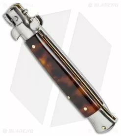 An impressive interpretation of the classic swinguard from AGA Campoloin. This knife measures 13 inches when opened and has a stylized swinguard. It features a polished stainless steel dagger blade, brass firing button, and a brass sliding safety. The rich stag handles are offset with brass pins, liners, and bolsters. The blade has fast, smooth action in spite of its size. The unique swinguard design gives the knife an almost medieval look. This is a must have for any serious Italian knife collector.