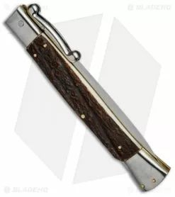 This Italian Stiletto from A.G.A. Campolin comes in the Swinguard style with a stag horn handle and a dagger blade. A.G.A. Campolin offers some of the finest traditional Italian Stiletto’s on the market, with a variety of collectible styles to choose from. This Swinguard model has a stag horn handle with nickel silver bolsters and buttons. Brass pins and liners add a classic touch to the design. The blade comes in a dagger style with a plain edge and a polished finish. Add a piece of Italian history to your collection with the A.G.A. Campolin 13″ Swinguard Stiletto.