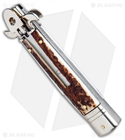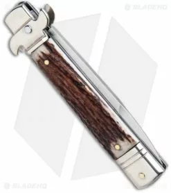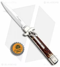 This 7.75″ Italian Stiletto from AKC comes in the Leverletto style with a stag handle and a bayonet blade. AKC specializes in collectible Italian stilettos made with traditional knife-making techniques. The blade comes in a bayonet style with a plain edge and a satin finish. Add classic Italian style to your collection with the AKC 7.75″ Leverletto stiletto.
