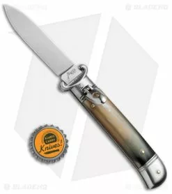 This 8″ Italian Stiletto from AKC comes in the Lever Lock Shot Puller style with a Brazilian horn handle and a flat grind blade. AKC specializes in collectible Italian stilettos made with traditional knife-making techniques. This 8″ Lever Lock model has a Brazilian horn handle with a sturdy stainless steel liner. Brass pins and nickel silver liners add a classic finishing touch to the design. The blade comes in a dagger style with a plain edge and a polished finish. Add classic Italian style to your collection with the AKC 8″ Lever Lock stiletto.