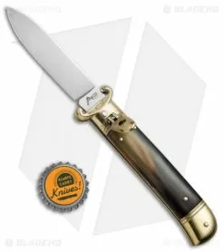 This 8″ Italian Stiletto from AKC comes in the Lever Lock Shot Puller style with a Brazilian handle, brass bolsters, and a flat grind blade. AKC specializes in collectible Italian stilettos made with traditional knife-making techniques. This 8″ Lever Lock model has a Brazilian handle with brass bolsters. Brass pins and liners add a classic finishing touch to the design. The blade comes in a dagger style with a plain edge and a polished finish. Add classic Italian style to your collection with the AKC 8″ Lever Lock stiletto.
