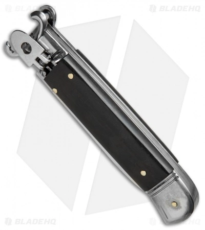 This 8″ Italian Stiletto from AKC comes in the Lever Lock Shot Puller style with an ebony wood handle and a flat grind blade. AKC specializes in collectible Italian stilettos made with traditional knife-making techniques. This 8″ Lever Lock model has an ebony wood handle with a sturdy stainless steel liner. Brass pins add a classic finishing touch to the design. The blade comes in a dagger style with a plain edge and a polished finish. Add classic Italian style to your collection with the AKC 8″ Lever Lock stiletto.