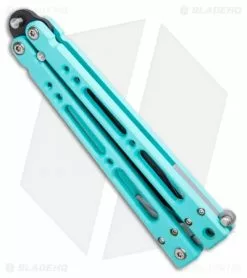 The Bear Song IV butterfly knife is a collaboration between BladeRunnerS (BRS) and Bear OPS. It is a lightweight flipper that is designed to be your go-to everyday carry knife. The B-400 model features teal finished aluminum handles with stainless steel spacers and a swappable latch. The pivots have 304 bearing surfaces and phosphorus bronze washers. The black powder coated steel clip point blade has a double tang pin design for great performance.