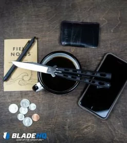 Bear and Sons manufacture quality butterfly knives. This knife features a tough black epoxy coating over zinc handles. The handles feature a skeletonized design to reduce weight. The Tanto-styled stainless steel blade has a plain edge and bead blast finish. Single tang pin construction makes this a nice mid-range butterfly knife. Built in the USA.