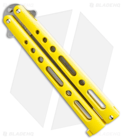 The Bear & Son 117R butterfly knife is built with durable yellow epoxy coated zinc handles with a skeletonized design for reduced weight. It features a stainless steel blade with a stonewash finish and a single tang pin. This is a solid mid-range butterfly knife, made right here in the USA.