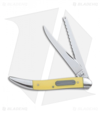 The Case Knives Fishing pocket knife is the perfect lightweight pocketknife to take with you while fishing. It features a Chromium Vanadium surgical stainless steel elongated clip point blade (also known as a long California clip) and a scaler blade with hook disgorger. It has tight spring tension construction ensuring safety while using a blade. The eel-like handle features yellow delrin scales with brass pin construction; nickel silver bolsters; brass liners and an inset hook sharpening stone.