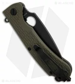- Partially serrated, black spear point blade made of 8Cr14MoV steel.