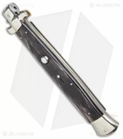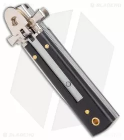 This 11″ Frank B. Italian stiletto features a polished bayonet blade, deployed using the push button. Olive wood scales add an elegant touch and are off set by the polished buttons and brass pins. It includes a sliding safety to protect against accidental release of the blade. The action on this knife is quick and smooth, and lock up is firm. The tang is stamped “Frank B. Italy.”