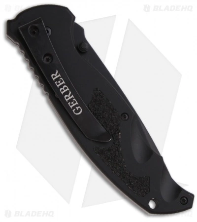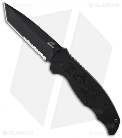 The Gerber Answer 3.25 Tanto Utilizing the F.A.S.T. technology, Gerber presents the Answer 3.25 spring assist knife. The Answer 3.25 Tanto features a black finished stainless steel blade with a serrated edge. Black aluminum handles feature texture inserts, providing a firm grip. Pocket clip for easy carry. The spring assist action on this knife is smooth and strong. Give the blade a start with the thumb-stud and the knife does the rest! The Answer 3.25 features a sliding lock on the knife’s front. Overall a rock-solid design and a great knife.