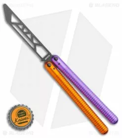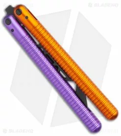 This SAHARA Jupiter balisong trainer features a black blade and blue and orange handles.