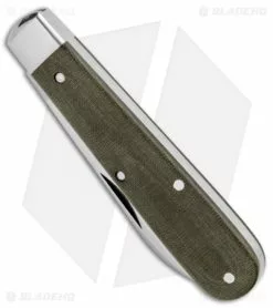 This Huckleberry Boy’s Knife model sports a polished drop point blade, OD green linen micarta handle scales, and polished steel bolsters.