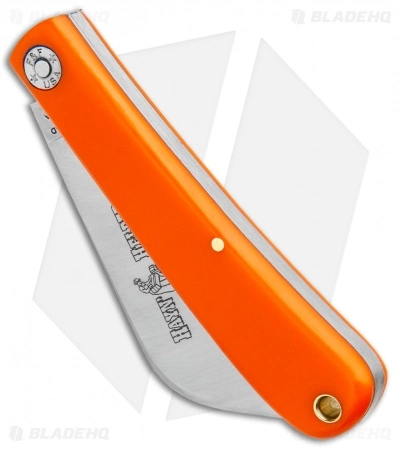 This Hayn’ Helper pocket knife features a single blade pocket knife design and an orange delrin handle. The Great Eastern Cutlery Hayn’ Helper pocket knife includes a large modified hawkbill style blade. Brass pins and a lanyard hole finish of the Hayn’ Helper Great Eastern Cutlery Farm and Field.