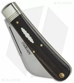 This Pruner pocket knife features a single blade pocket knife design and a Gabon ebony handle. The Northfield UN-X-LD Pruner pocket knife includes a large modified hawkbill style blade. Nickel silver bolsters and brass liners add a classic flair to the design. Brass pins and a nickel silver inlay finish of the impressive Pruner design from GEC Northfield UN-X-LD.