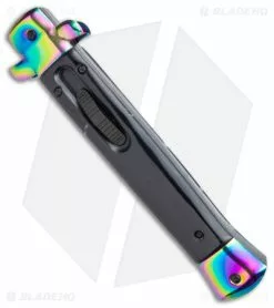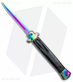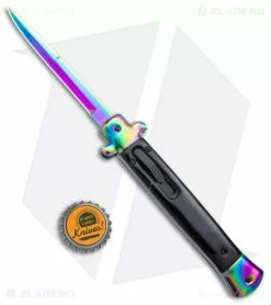 Pick up a unique and collectible design with the Mago 11″ Italian Stiletto OTF automatic knife. This OTF model is built with a black marbled acrylic handle and a rainbow finished bayonet blade and bolsters. It features classic Italian made craftsmanship and a dependable double-action OTF mechanism. Item includes a nylon sheath for secure belt carry.