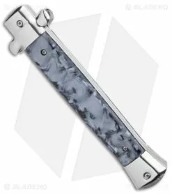 Pick up a unique and collectible design with the 11″ Italian Stiletto OTF automatic knife. This OTF model is built with a silver aluminum handle with silver bolsters, black marbled acrylic scales and a satin bayonet blade. It features classic Italian made craftsmanship and a dependable double-action OTF mechanism.
