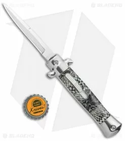 Pick up a unique and collectible design with the 9″ Italian Stiletto OTF automatic knife. This OTF model is built with an acrylic “Cottonmouth” handle and a satin finished bayonet blade. It features classic Italian made craftsmanship and a dependable double-action OTF mechanism. Item includes a nylon sheath for secure belt carry.