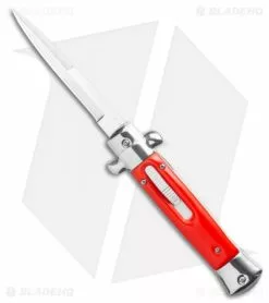 Pick up a unique and collectible design with the 9″ Italian Stiletto OTF automatic knife. This OTF model is built with a silver aluminum handle with red acrylic scales and a satin bayonet blade. It features classic Italian made craftsmanship and a dependable double-action OTF mechanism. Item includes a nylon sheath for secure belt carry.
