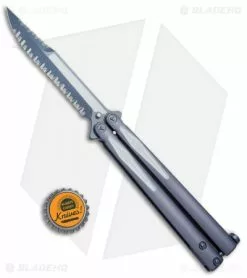 The latest generation of the Tachyon butterfly knife, the production Microtech Tachyon III, distinguishes itself from previous models with milled, single-piece channel construction handles, a spring latch, and a standard pocket clip. The blade showcases a non-sharpened swedge-ground tip and milled grooves with the Microtech logo, production date, and blade steel markings up front.