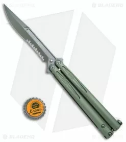 The latest generation of the Tachyon butterfly knife, the production Microtech Tachyon III, distinguishes itself from previous models with milled, single-piece channel construction handles, a spring latch, and a standard pocket clip. The blade showcases a non-sharpened swedge-ground tip and milled grooves with the Microtech logo, production date, and blade steel markings up front.