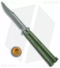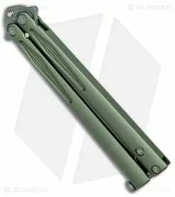 The latest generation of the Tachyon butterfly knife, the production Microtech Tachyon III, distinguishes itself from previous models with milled, single-piece channel construction handles, a spring latch, and a standard pocket clip. The blade showcases a non-sharpened swedge-ground tip and milled grooves with the Microtech logo, production date, and blade steel markings up front.