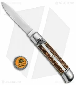 This Old Style Stiletto comes in the Lever Lock style with a stag handle and a flat grind blade. Old Style offers collectible Italian stilettos made with traditional knife-making techniques. This 8″ Lever Lock model has a stag antler handle with a sturdy stainless steel liner. Brass pins add a classic finishing touch to the design. The blade comes in a dagger style with a plain edge and a polished finish. Add classic Italian style to your collection with the Old Style Lever Lock stiletto.