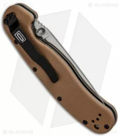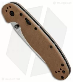 This Assisted RAT Model 1 features textured coyote brown G-10 scales and a satin finished AUS-8 stainless steel blade with a plain cutting edge.