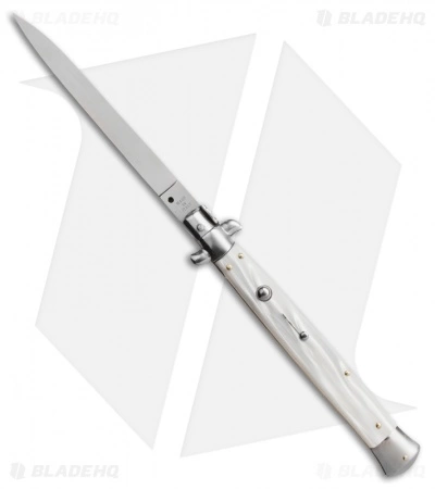 This 13″ Italian Stiletto from SKM Italy offers classic stiletto style with a white pearlex handle and a satin finished blade. SKM makes a variety of Italian stilettos featuring traditional designs at an affordable price. This 13″ model has a pearlex handle with stainless steel bolsters. Brass pins and liners add a classic finishing touch to the piece. The blade has a flat grind with a plain edge and a satin finish. Experience the affordable Italian quality of these authentic stilettos from SKM Italy.