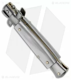 This 7″ Italian Stiletto from SKM Italy offers classic stiletto style with a white pearlex handle and a satin finished blade. SKM makes a variety of Italian stilettos featuring traditional designs at an affordable price. This 7″ model has an acrylic handle with stainless steel bolsters. Brass pins and liners add a classic finishing touch to the piece. The blade has a flat grind with a plain edge and a satin finish. Experience the affordable Italian quality of these authentic stilettos from SKM Italy.