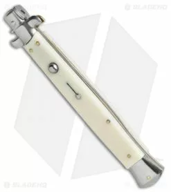 This 13″ Italian Stiletto from AB Italy offers classic stiletto style with a simulated ivory handle and a satin finished, flat ground blade. Brass pins and liners against nickel silver bolsters add a classic finishing touch to the piece. The bayonet blade has a plain edge and a satin finish. Experience the affordable Italian quality of these authentic stilettos from SKM/AB Italy.