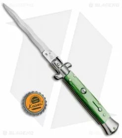 This 9″ Italian Stiletto from SKM Italy offers classic stiletto style with a green acrylic handle and a satin finished kris blade. SKM makes a variety of Italian stilettos featuring traditional designs at an affordable price. This 9″ model has an acrylic handle with stainless steel bolsters. Brass pins add a classic finishing touch to the piece. The kris blade has a plain edge and a satin finish. Experience the affordable Italian quality of these authentic stilettos from SKM Italy.