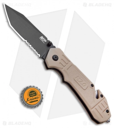 The FDE Smith and Wesson M&P S.A. is a no-frills tactical rescue knife with FDE aluminum handle scales, a glass breaker, a seat belt cutter, a spring assisted partially serrated blade, and a tip down deep carry pocket clip. Add this knife to your kit today!