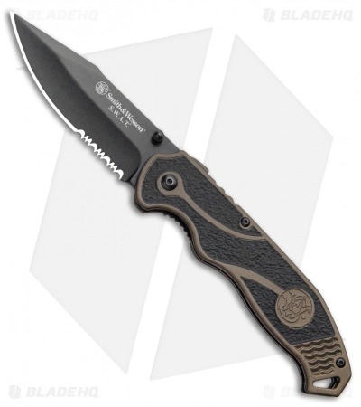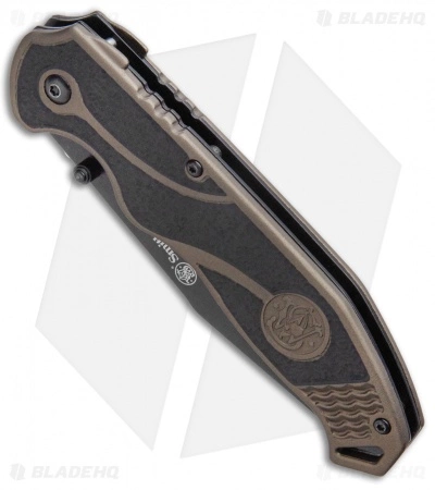 This Smith and Wesson Spring assisted knife has got a sweet bronze colored handle with black traction inlays for a secure grip and tactical look. The black coated clip point partially serrated blade is opened with thumb studs and a spring assist. This beefy knife is ready for action!